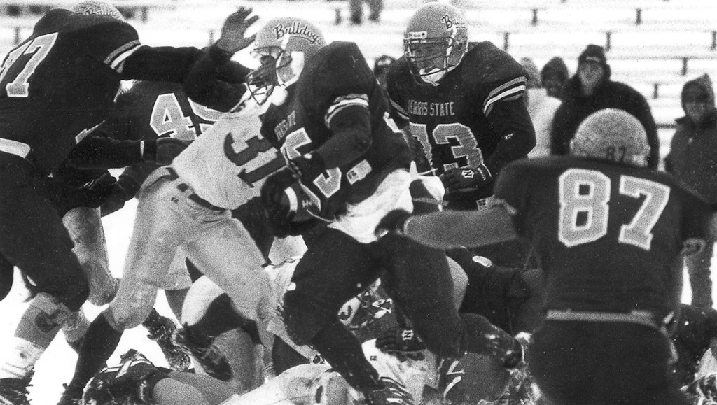 The never-say-die Bulldogs completed a perfect 10-0 regular season by never panicking and never blinking in the face of adversity to stun upsetminded Saginaw Valley State, 46-42, in the Midwest Intercollegiate Football Conference (MIFC) regular-season finale at Top Taggart Field in Big Rapids. The game has often been referred to as the Snow Bowl.