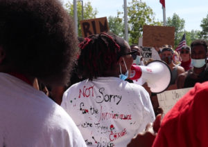 Scenes from the Enough Is Enough protest that took place on Ferris State University’s Big Rapids campus on June 3. A woman holds a megaphone and wears a shirt that reads “Not sorry for the inconvenience, we’re trying to change the world.” (Credit: Hannah Crouch)