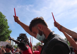 Scenes from the Enough Is Enough protest that took place on Ferris State University’s Big Rapids campus on June 3. A protester in the foreground raises a candle during a moment of silence, with other protesters doing the same in the background. (Credit: Hannah Crouch)